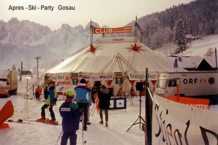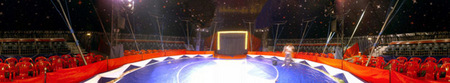 4-Mastenzelt weiß mit roten Sternen an den Mastöffnungen, 26 m Durchmesser mit oder ohne Sitzgalerie (2 Reihen Schalensessel, 4 Bankreihen), innen dunkelblau mit Sternen, Fassungsvermögen mit Galerie und ebenerdig aufgestellten Stühlen ca. 400 Personen.