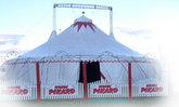 Modernes 2-Mastenzelt weiß mit roten Sternen, 19 m Durchmesser, mit oder ohne Sitzgalerie (dreireihig), innen dunkelblau mit Sternen, freie Sicht von allen Seiten, Fassungsvermögen mit Galerie und ebenerdig aufgestellten Stühlen ca. 280 Personen. ein Restaurationszelt, 12 x 20 m, mit zwei Spitzen (auch teilbar), weiß mit roten Spitzen und roter Umrandung.